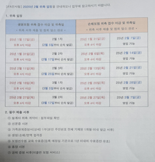 위촉서류 제출 및 협회 말소완료일 기준 다음달 코드 발급일자 예시